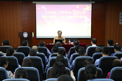 专题辅导报告会上,忻平教授以国庆七十周年大典为引入,结合丰富的史料回顾了有关重大事件、重要会议、重要经验,带领我们重温了党的光荣传统、宝贵经验和伟大成就,全面讲解了学习党史、新中国史的必要性和深刻内涵,并回顾了上海解放的历史,重点阐述了上海解放70年来的巨大成就。两个多小时的讲座中,忻平教授引经据典、娓娓道来,以深入浅出的语言,在潜移默化中向大家传递着中国共产党的宗旨性质、理想信念、爱国主义情感和中华民族伟大复兴的梦想与信心。